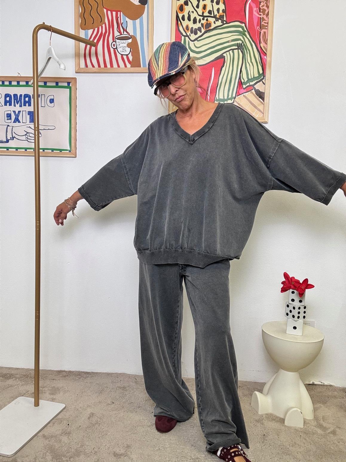 Morbidezza vissuta, stile rilassato.Il pantalone perfetto per chi ama i capi comodi, ma non ha intenzione di rinunciare allo stile. Questo modello ampio in morbida felpa di cotone è stato tinto in capo per ottenere un effetto vintage unico e leggermente polveroso, dal sapore artistico e super autentico.La gamba è larga e fluida, con pieghe naturali che si formano con il movimento, mentre la vita elasticizzata con coulisse regolabile offre una vestibilità adattabile e relaxed. Il fit è destrutturato, perfetto per un look loungewear-chic o per uno stile urban da tutti i giorni.Dettagli prodotto: Colore: Grigio scuro effetto stone washed (tinto in capo) Vestibilità: Ampia, a gamba larga Vita: Alta con elastico e coulisse regolabile Tasche laterali inserite Lunghezza: Full length Tessuto: Felpa leggera in 100% cotone Tintura: Tinta in capo per effetto vissuto unico su ogni pezzo Made in Italy / Produzione artigianaleDa abbinare a:La felpa coordinata per un total look comfy e cool (come in foto), oppure con una camicia bianca oversize e sneakers chunky per un mix urbano rilassato.
