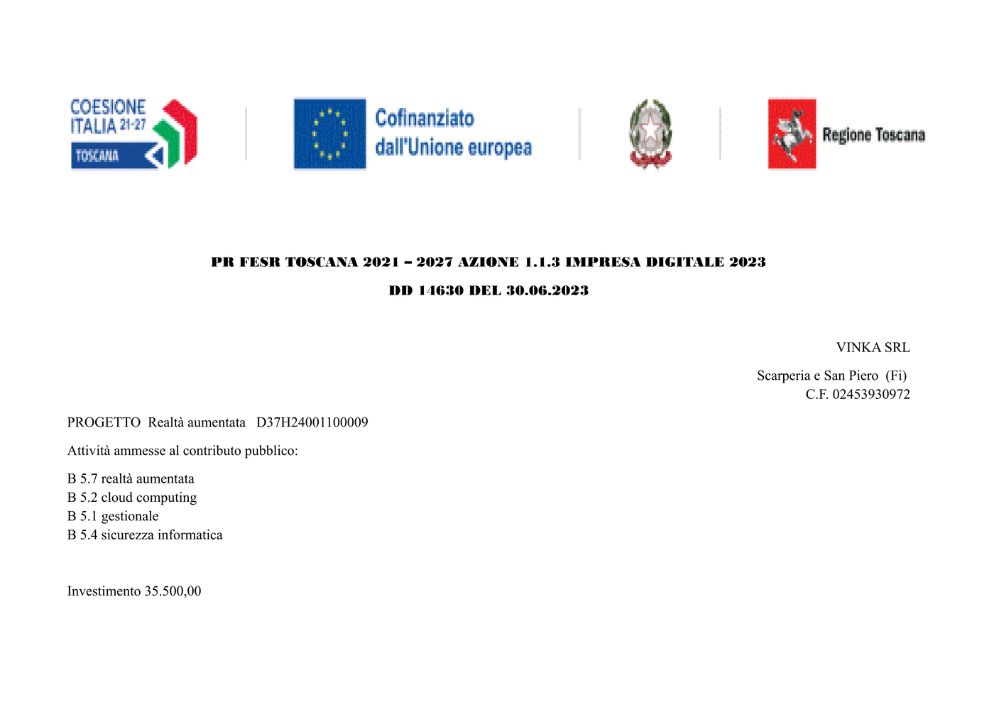 Vinka S.R.L. ha beneficiato di contributi regionali per il miglioramento del proprio sito web. L’intervento ha avuto l’obiettivo di integrare tecnologie avanzate legate all’intelligenza artificiale e al Cloud Computing. Attraverso queste innovazioni, l’azienda ha potuto migliorare e ottimizzare i propri sistemi digitali. Questo progetto rappresenta un passo importante nel nostro percorso di digitalizzazione e innovazione continua.